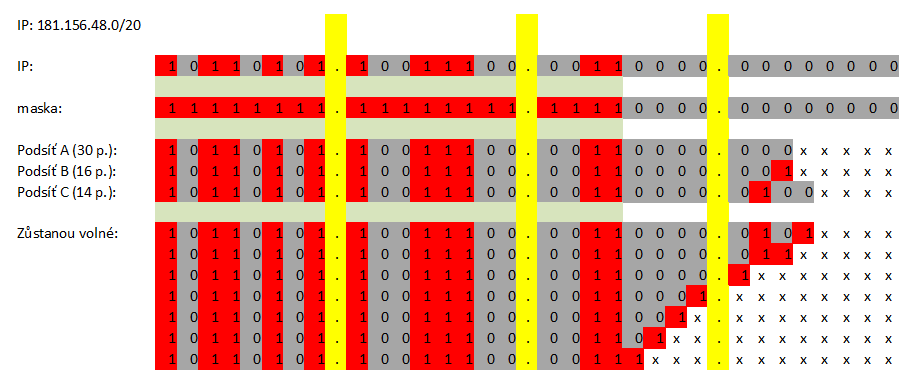 (Subnetting 181.156.48.0/20 na podsítě s 30, 16 a 14 počítači s minimálním využitím adres.) |