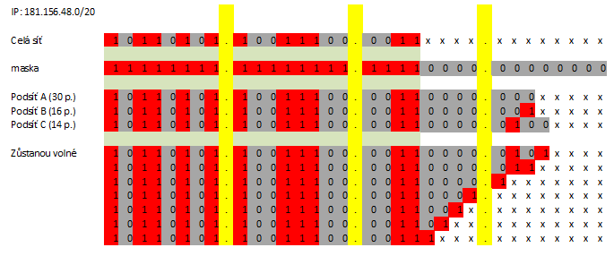 Subnetting 181.156.48.0/20 na podsítě s 30, 16 a 14 počítači s minimálním využitím adres.